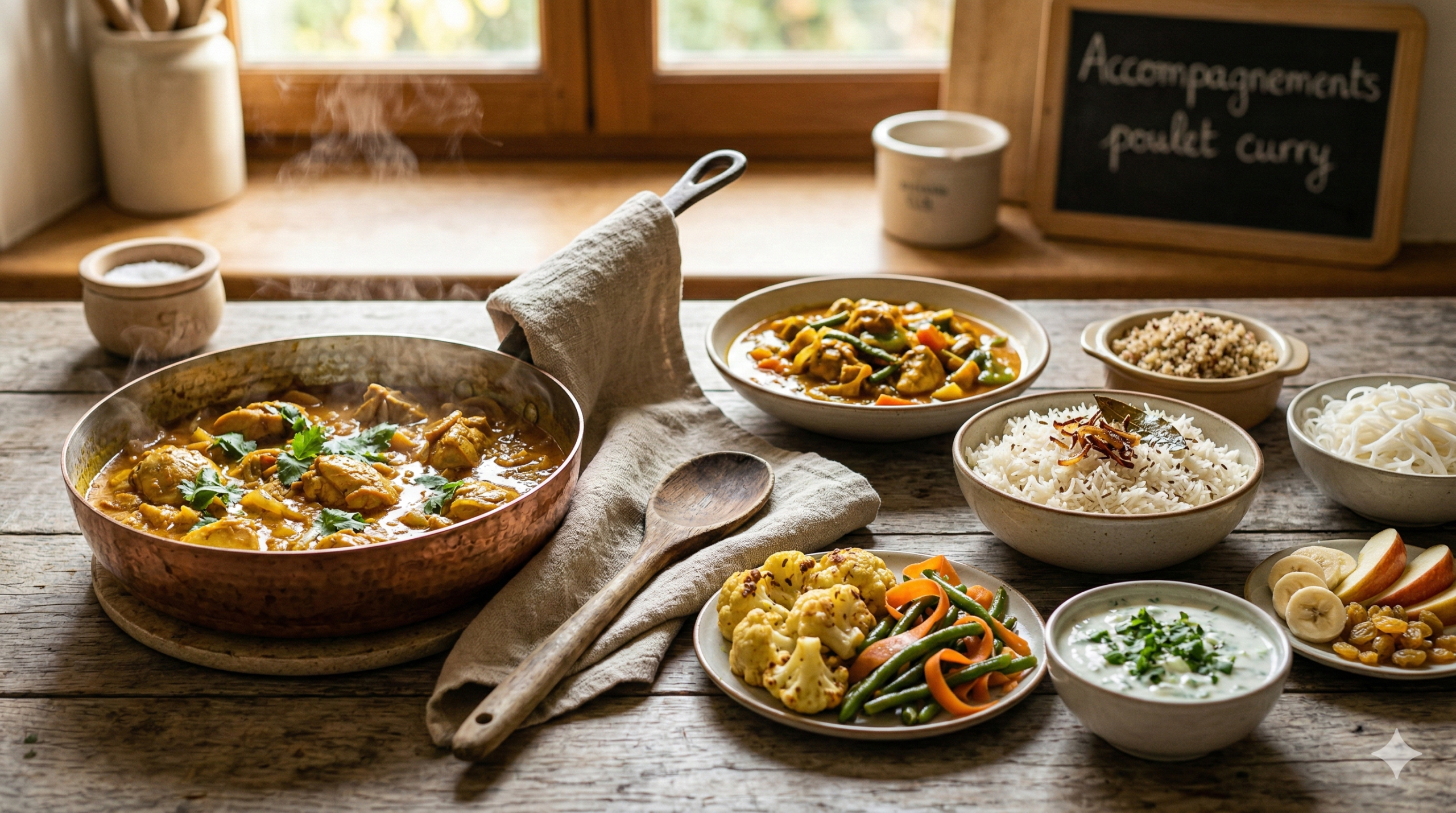 Un poulet au curry mérite un accompagnement qui joue avec lui, pas contre lui. La sauce est souvent douce, crémeuse, légèrement épicée. Elle a besoin d’un féculent pour être absorbée, de légumes pour équilibrer, et parfois d’une touche fraîche pour alléger.
