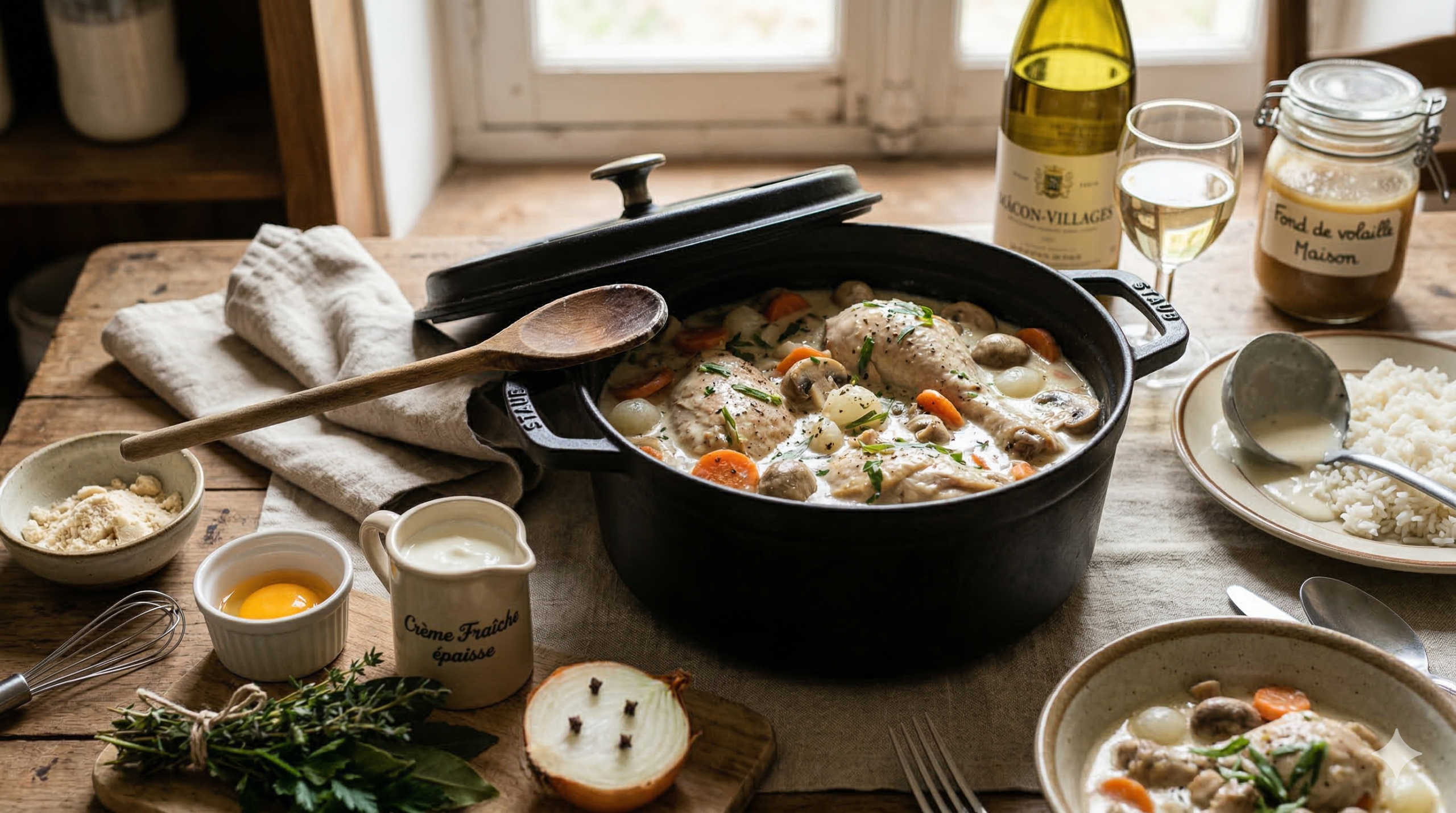 Le fond de volaille (1 à 2 cuillères à café) booste le goût de manière significative, surtout si vous utilisez un simple cube de bouillon. C’est souvent ce petit détail qui distingue une blanquette mémorable d’une version ordinaire.