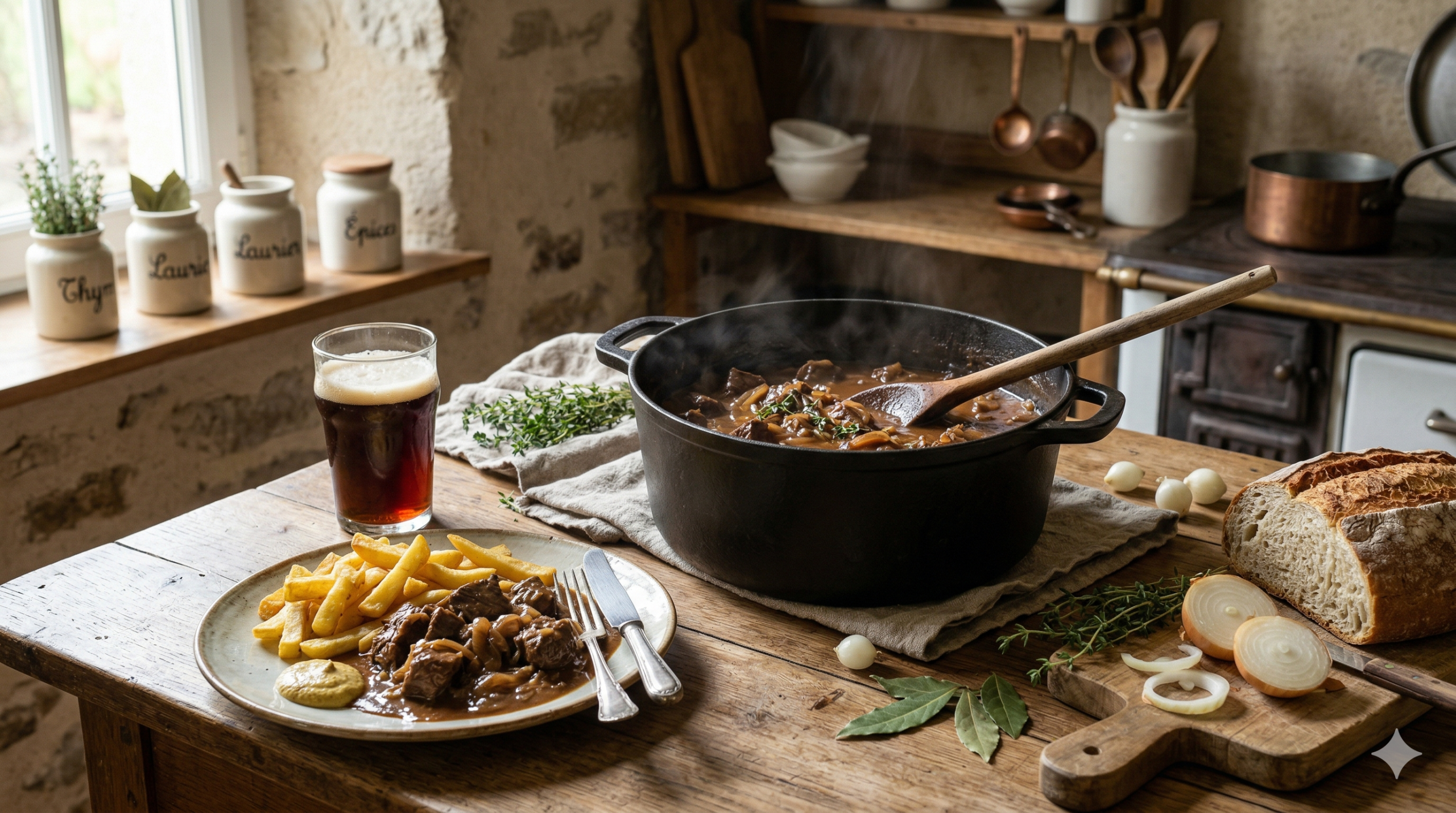 Les frites maison restent l’accompagnement le plus traditionnel et le plus apprécié. La pomme de terre absorbe la sauce et complète parfaitement la viande. Une purée maison ou des pommes de terre vapeur conviennent tout aussi bien. Des pâtes fraîches fonctionnent pour une version plus légère. Le pain de campagne reste incontournable pour saucer. Côté boisson, une bière brune de la même famille que celle utilisée en cuisine s’impose naturellement. Un rouge du Nord ou un côtes-du-rhône fruité fonctionne aussi très bien.