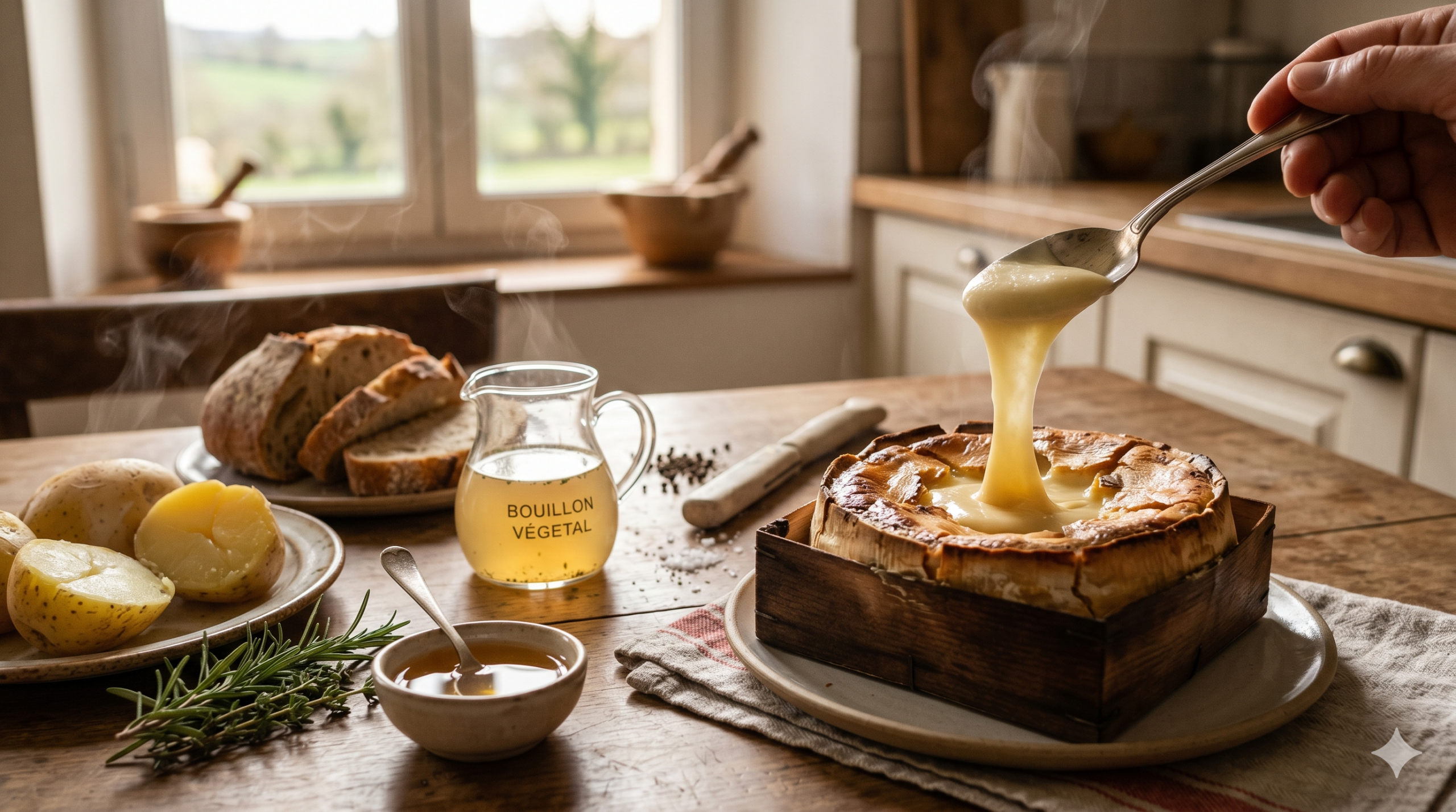Le bouillon de légumes est l’alternative la plus polyvalente. Il apporte du goût sans s’imposer. Un bouillon maison ou un bouillon cube de qualité font très bien l’affaire. Il convient à tous les profils, y compris aux végétariens. C’est notre recommandation de base au Bistrot du curé pour tous ceux qui débutent avec cette recette. Versez 4 à 5 cl sur le fromage incisé, ajoutez deux gousses d’ail et un tour de moulin à poivre. Le résultat est franc, propre et généreux.