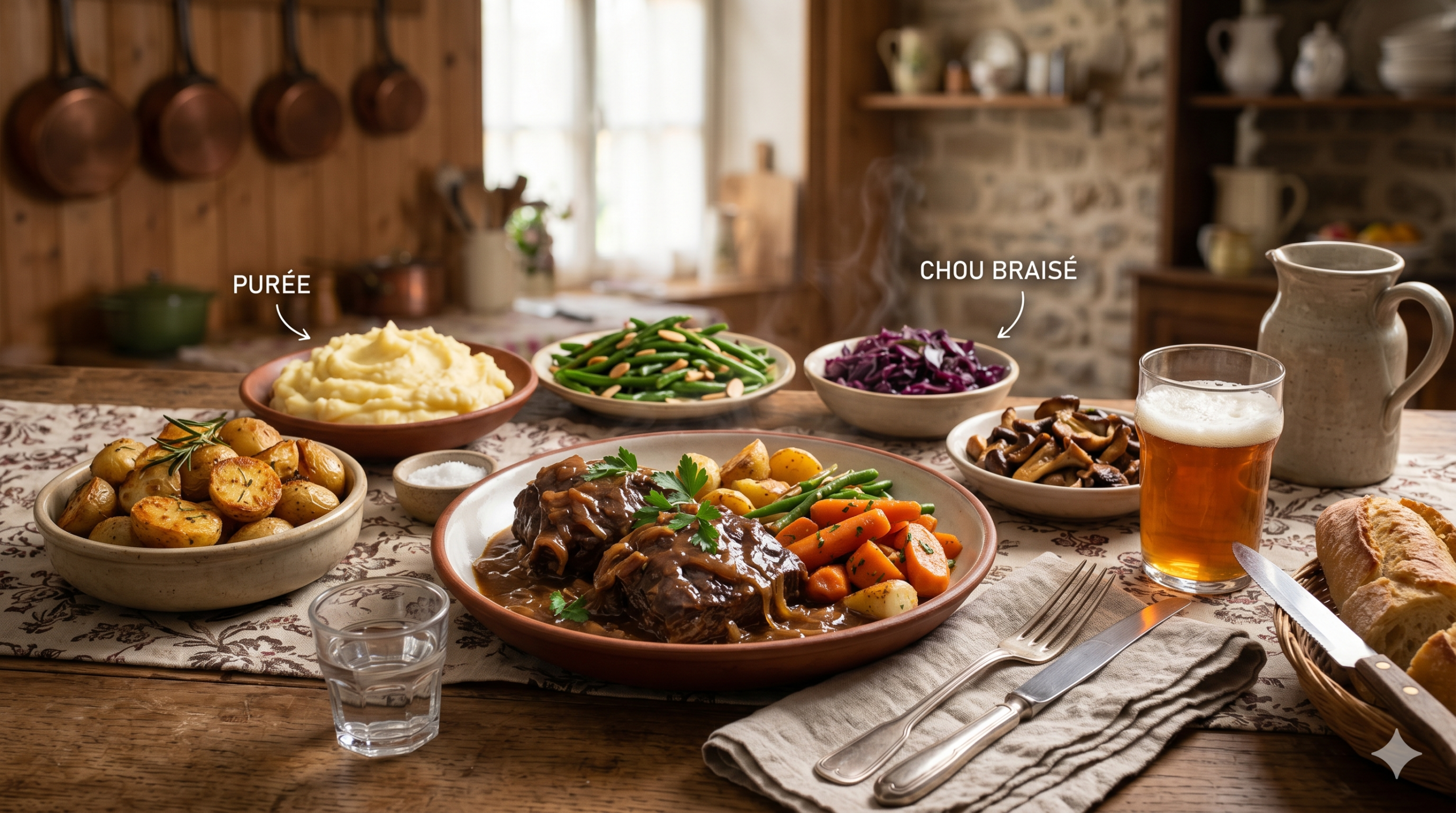 Ce plat repose sur trois piliers : une viande fondante après 1 h 30 à 3 heures de mijotage, une sauce riche et parfumée à la bière brune ou ambrée, et un accompagnement bien choisi. Le bon choix doit répondre à quatre mots : fondant, croquant, doux, frais.